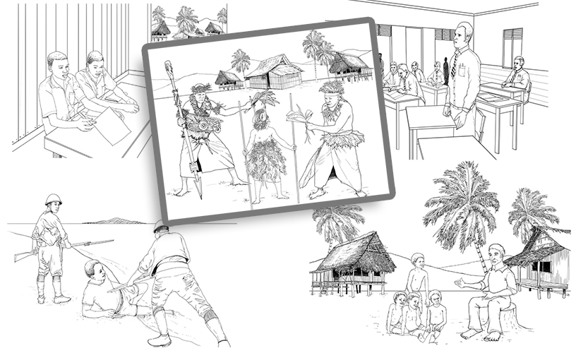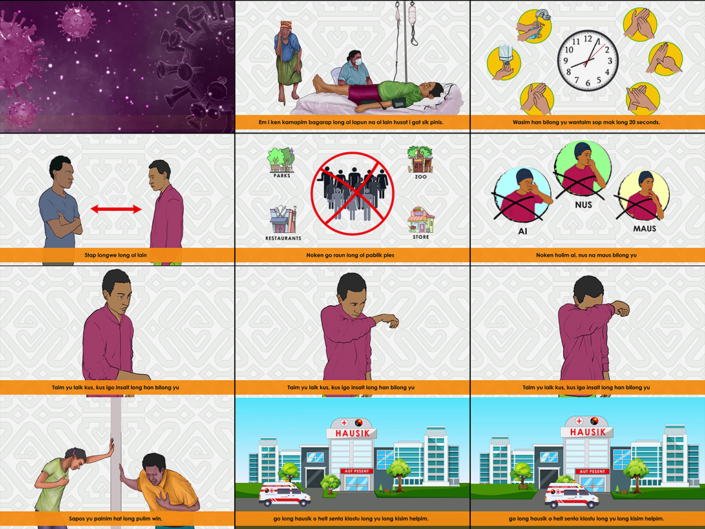 Illustrations done using ABC Tok Pisin script to create awareness on COVID-19, commissioned by the Papua New Guinea Australia Association Victoria. 2020. Watch the short animation awareness here