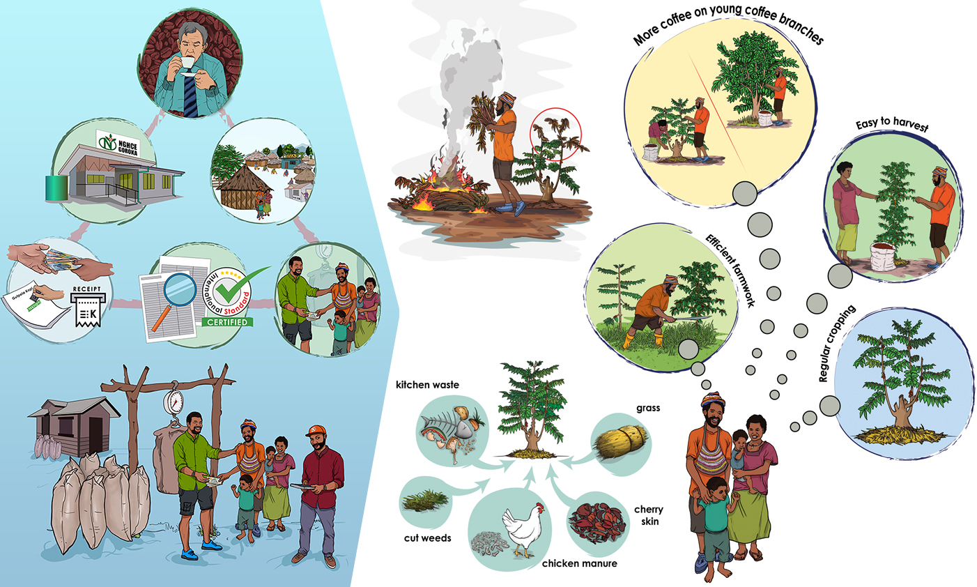 Sample illustrations for a set of over hundred illustrations done for several training modules commissioned by New Guinea Highlands Coffee. 2020 - 2021.